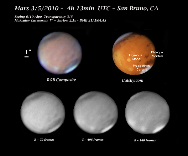 This is probably my best photography of Mars even though it does not exhibit the side of mars with the most features.  The seeing was great for my location (Alpo seeing 6/10). Mars was quite high in the sky. The conditions were as good as for the shot I took in November.  Orographic clouds over  Olympus Mons can be seen, and as well as albedo features such as  Phlegra Montes, Phlegethon Catena and Amazonis Planitia. Picture taken at roughly f/d 40 using a 2.5x Siebert optics barlow with DMK B&K Camera – about 1,500 rgb frames  – each frane between 1/10 and 1/15 sec of exposure.