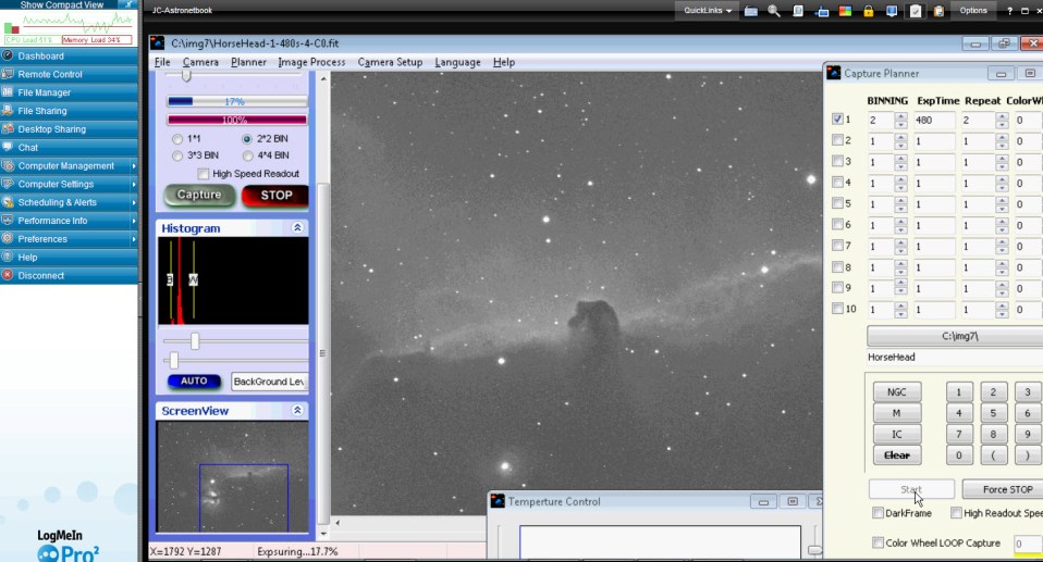 Here is a screenshot of the log me in screen with remote access to the Netbook controlling the imaging set up: