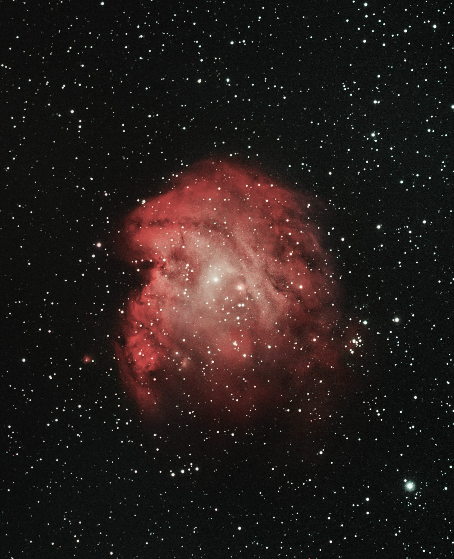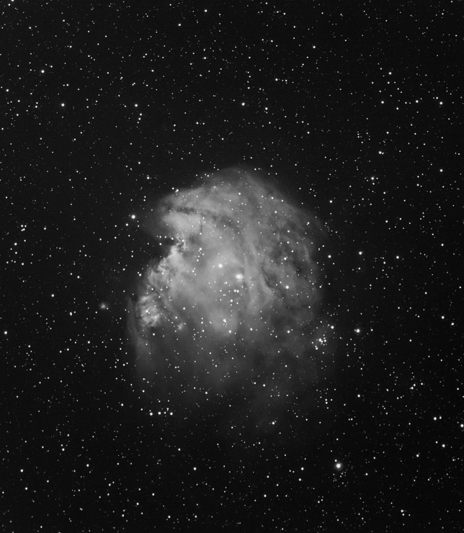 On the left, the H-Alpha image, on the right the HOO composite image. Note the Monkey nebula emits mainly in H-Alpha only the central parts of the nebula glows in the OIII band.