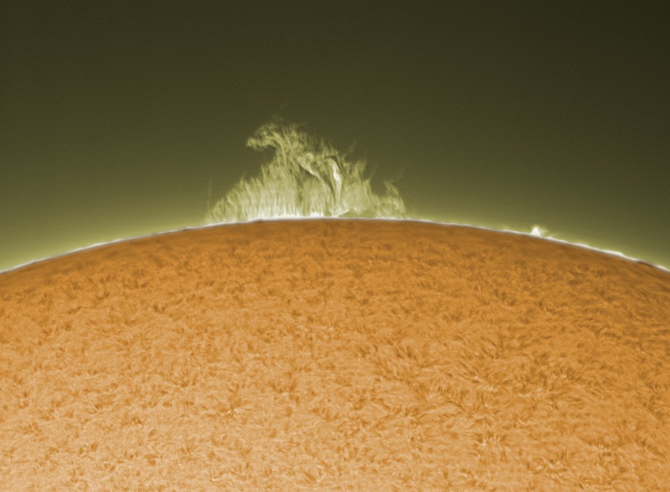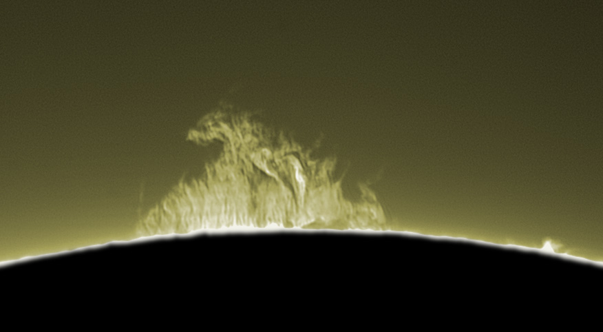 The picture below is a composite of two set of pictures, one with longer exposures to capture details in the prominences, and one with shorter exposures to capture details on the solar limb.