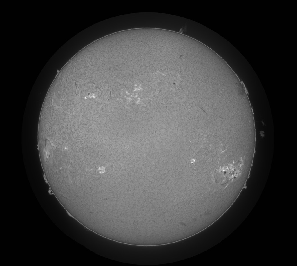 The same image at the same time, with a Stellarvue SVX 100mm, a Herschel Wedge and a Calcium K filter (Baader Calcium-K 8nm). I am using the same camera as above. The Faculae are more visible on the Sun’s surface. Don’t look at the Sun using such filter as the UV will harm your eyes. This was taken on 5/11/2024 at 19h57 UTC from Concord, CA.