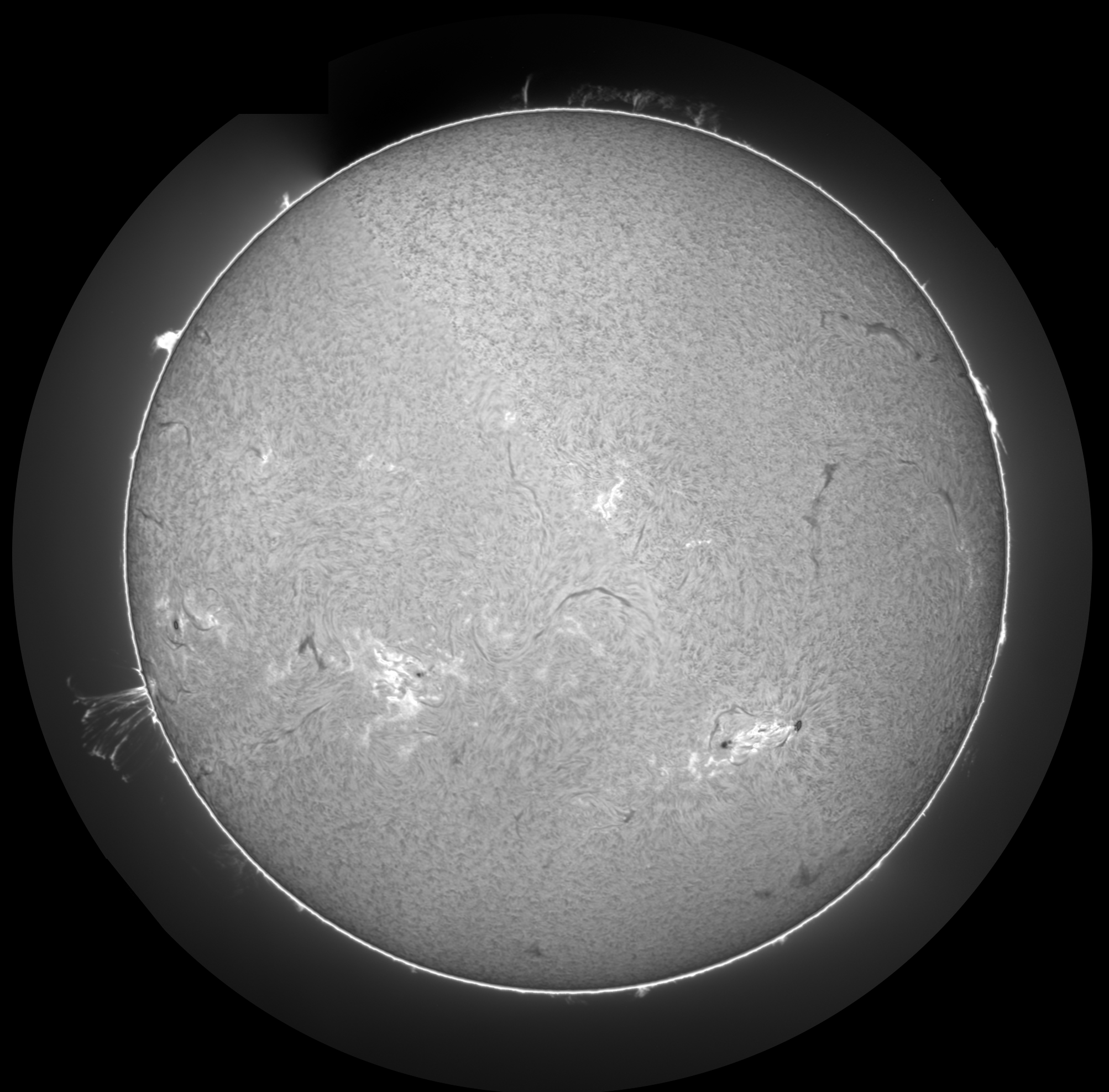 Another day of strong solar activity. This is captured in H-Alpha using my William Optics 60mm Refractor, with a Daystar Quark Filter. This is a mosaic of 4 images made from 300 frames each. The Camera used was a ZWO ASI 432MM. Image was captured the 1st of September 2024 at 19h43 UTC from Concord, CA.